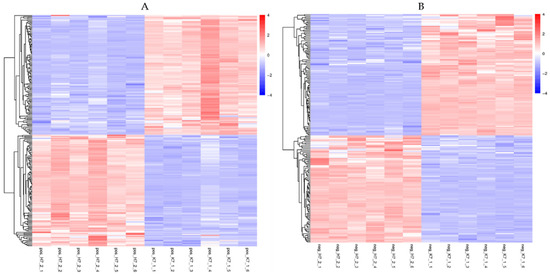 Heatmap of metabolites. Red indicates high abundance, whereas low relative metabolites are shown in blue ((A): positive ion mode, (B): negative ion mode). COS treatment sample: H7_2_1-H7_2_6; control: K7_1_1-K7_1_6).