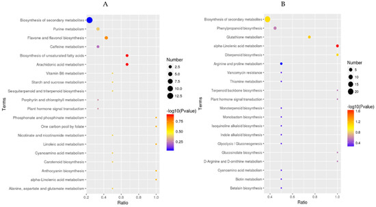 KEGG pathways were organized and analyzed to explore the functions of COS on the DMs related to tea plant development (Figure 8). The color of the point represents the p-value of the hypergeometric test. The smaller the value, the more reliable and statistically significant the result is. The size of the dots represents the number of differential metabolites in the corresponding pathway; the larger size indicates a higher significant differential of metabolites in the pathway. It could be seen that the DMs were mainly enriched in the following six pathways, “biosynthesis of secondary metabolites”, “Phenylpropanoid biosynthesis”, “flavone and flavonol biosynthesis”, “alpha−Linolenic acid metabolism”, “Biosynthesis of unsaturated fatty acids”, “Arachidonic acid metabolism”, and “Glutathione metabolism” (Figure 8, Table S10). DMs enriched in these metabolic pathways may play an immediate physiological role and promote and influence growth and development. Among them, the most enrichment of differential metabolites pathway is the biosynthesis of secondary metabolites, and 33 DMs were found in it (Table S11), including amino acids (L-Histidine, L-Ornithine, L-Asparagine), organic acids (Loganic acid, Ferulic acid, Ascorbic acid), flavonoids (Rutin, Kaempferol, Quercetin), and other compounds. The above results showed that COS treatment could significantly increase the production of secondary metabolites in tea plants, thereby promoting the growth and development of tea plants.