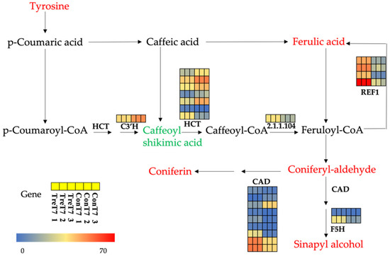 The transcriptomic analysis showed that DEGs in pathways of the plant hormone signal transduction, starch, and sucrose metabolism, phenylpropanoid biosynthesis, glycolysis/gluconeogenesis, and carbon fixation in photosynthetic organizations, and biosynthesis of amino acids of tea plants were significantly enriched in COS treatment. Metabolomics data indicated a total of 1339 differential metabolites were enriched in different metabolic pathways, including the most enriched biosynthesis of secondary metabolites and phenylpropanoid biosynthesis. A combined metabolic and transcriptomic analysis was performed to investigate the potential for the regulation of related metabolites. The result showed that the DEGs and DMs were significantly up-regulated in phenylpropane metabolism pathways. It may refer that the differential genes and metabolites in phenylpropane metabolism play an important role in the growth and development of tea plants. The DEGs and DMs in the phenylpropanoid biosynthesis pathway were summarized and sorted through the KEGG database (Table S12). The metabolic intermediates and end products of the phenylpropanoid biosynthesis pathway were mapped to the known KEGG pathway. The overall trends of the phenylpropanoid biosynthesis pathway suggested an increase both in metabolic intermediates (such as ferulic acid and coniferyl-aldehyde) and end products (such as coniferin and sinapyl alcohol) by spraying COS on tea plants (Figure 9).