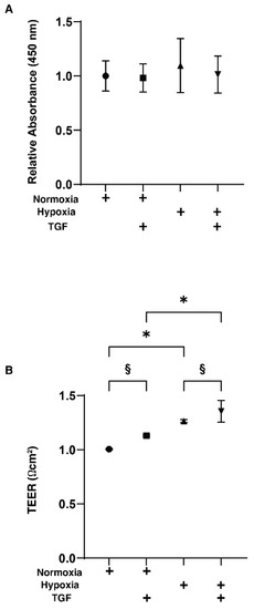 Effects of TGF-β2 on cell viability and transendothelial electrical resistance (TEER) measurements of 2D HRPE monolayers under normoxia or hypoxia conditions. The 2D HRPE cell monolayers prepared under normoxia or hypoxia conditions were treated without (control) or with a 5 ng/mL solution of TGF-β2 (TGF). The 2D cultures of HRPE monolayers at Day 6 were subjected to (A) cell viability by a CCK-8 kit and (B) barrier function analyses by electric resistance (Ω cm2) measurements using TEER, and each relative ratio against the normoxia conditions without TGF-β2 was plotted. All experiments were performed in triplicate using fresh preparations. “+” is reagents addition. Data are presented as the arithmetic mean ± the standard error of the mean (SEM). * p < 0.05 normoxia vs. hypoxia, § p < 0.05 control vs. TGF (ANOVA followed by a Tukey’s multiple comparison test).