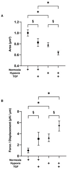 Effects of TGF-β2 on the physical properties, sizes and stiffness of 3D HRPE spheroids under normoxia or hypoxia conditions. Three-dimensional HRPE spheroids at Day 6 prepared under normoxia or hypoxia conditions were treated without (control) or with a 5 ng/mL solution of TGF-β2 (TGF). The mean sizes of 3D HRPE spheroids were measured and each relative ratio against the normoxia conditions without TGF-β2 are plotted in panel (A). The physical solidity of the 3D HRPE spheroids was analyzed by a micro-squeezer and the force required to produce a 50% deformity of a single spheroid during a period of 20 s (μN/μm) was plotted in panel (B). All experiments were performed in triplicate using fresh preparations consisting of 16 spheroids each. “+” is reagents addition. Data are presented as the arithmetic mean ± standard error of the mean (SEM). * p < 0.05 control vs. TGF, § p < 0.05 normoxia vs. hypoxia (ANOVA followed by a Tukey’s multiple comparison test).