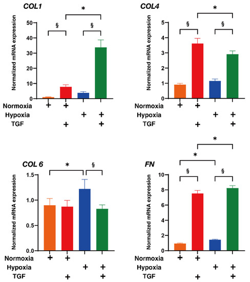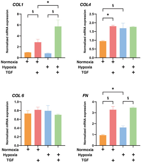 Effects of TGF-β2 on mRNA expression of ECMs of 3D HRPE spheroids under normoxia or hypoxia conditions. Three-dimensional HRPE spheroids at Day 6 prepared under normoxia or hypoxia conditions were treated without (control) and with a 5 ng/mL solution of TGF-β2 (TGFβ), and each sample was subjected to qPCR analysis and the expression of mRNA in ECMs, COL1, COL4, COL6, and FN were estimated. All experiments were performed in duplicate using fresh preparations (n = 10 spheroids each). “+” is reagents addition. Data are presented as the arithmetic mean ± the standard error of the mean (SEM). * p < 0.05 control vs. TGF, § p < 0.05 normoxia vs. hypoxia (ANOVA followed by a Tukey’s multiple comparison test).
