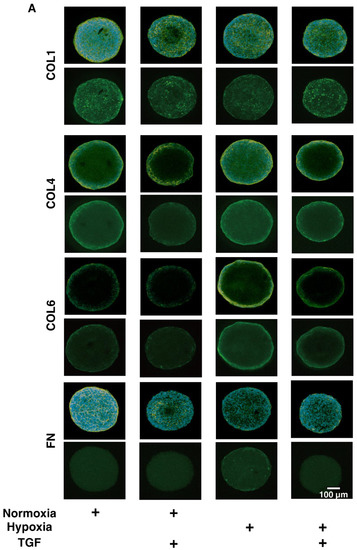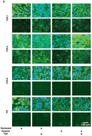 To study this issue further, the expressions of major ECM proteins, including collagen1 (COL1), COL4, COL6, and fibronectin (FN) under the above conditions were examined by qPCR analysis by immunohistochemistry. An analysis by qPCR (Figure 3) indicated that, in the 2D HRPE cells, (1) COL1, COL4 and FN were significantly up-regulated by TGF-β2 under both normoxia and hypoxia conditions, (2) the mRNA expressions of COL6 and FN in the absence of TGF-β2 under hypoxia conditions were also significantly higher than those under normoxia conditions, and (3) the production of COL6 was substantially down-regulated by TGF-β2 under hypoxia conditions. Similar but lesser differences in the expression of ECM molecules were also observed among these experimental conditions as evidenced by immunohistochemistry (Figure 4). Alternatively, in the 3D HRPE spheroids, the mRNA expression of COL1 and FN were also significantly up-regulated by TGF-β2 under both normoxia and hypoxia conditions, and the expression of COL4 and FN under hypoxia conditions were markedly higher than those under normoxia conditions (Figure 5). While, in contrast, the immunolabeling of these ECMs in the case of 3D HRPE spheroids was different compared to their mRNA expressions (Figure 6), that is, (1) TGF-β2-induced down-regulation of COL4 and COL6 or COL4 were recognized under both normoxia and hypoxia conditions, respectively, (2) in the absence of TGF-β2, the expression of COL1 under hypoxia conditions was significantly lower than that under normoxia conditions, and (3) in the presence of TGF-β2, the expression of COL4 under hypoxia conditions was significantly higher than those under normoxia conditions. The diversity between qPCR and the immunolabeling of the 3D spheroids was also reported in our previous study using cells from other sources [30,31,33,34,35]. As a possible explanation for this, we speculate that immunolabeling adequately reflects the expression of target molecules that are located on the surface of the 3D spheroids, while, in contrast, the qPCR analysis reflected the total expression. These collective observations indicate that EMT were significantly and synergistically induced by the TGF-β2 treatment and hypoxia in both 2D HRPE cells and the 3D HRPE spheroids.