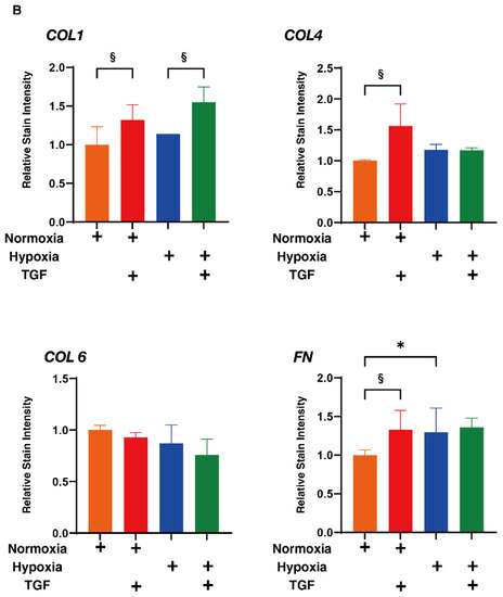 Immunolabeling of ECMs of the 2D cultured HRPE cells under normoxia or hypoxia conditions. 2D cultured HRPE cells at Day 6 prepared under normoxia or hypoxia conditions were treated without (control) or with a 5 ng/mL solution of TGF-β2 (TGF), and each sample was subjected to immunostaining for COL1, COL4, COL6, and FN. All experiments were performed in duplicate using fresh preparations (n = 5). Representative images (upper; merge with DAPI, lower; anti-ECM, scale bar; 100 μm) are shown in panel (A) and relative staining intensities against the normoxia conditions without TGF-β2 are plotted in panel (B). “+” is reagents addition. Data are presented as the arithmetic mean ± standard error of the mean (SEM). * p < 0.05 control vs. TGF, § p < 0.05 normoxia vs. hypoxia (ANOVA followed by a Tukey’s multiple comparison test).