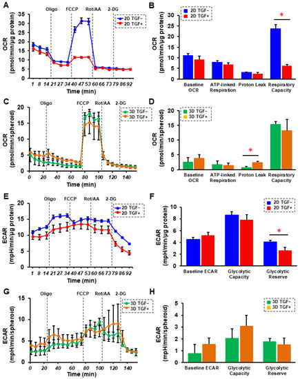Effects of TGF-β2 on the cellular metabolic phenotype of the 2D and 3D cultured HRPE cells. Two-dimensional and 3D cultured HRPE cells at Day 6 prepared under normoxia conditions were treated without (control) and with a 5 ng/mL solution of TGF-β2 (TGF), and each sample was subjected to a real-time metabolic function analysis using a Seahorse XFe96 Bioanalyzer. (A) Measurements of oxygen consumption rate (OCR) in 2D HRPE cells without and with TGF treatment. (B) Baseline OCR, ATP-linked respiration, proton leak, and respiratory capacity in 2D HRPE cells. (C) Measurements of oxygen consumption rate (OCR) in 3D HRPE spheroids without and with TGF. (D) Baseline OCR, ATP-linked respiration, proton leak, and respiratory capacity in 3D HRPE spheroids. (E) Measurements of extracellular acidification rate (ECAR) in 2D HRPE cells without and with TGF. (F) Baseline ECAR, glycolytic capacity, glycolytic reserve in 2D HRPE cells. (G) Measurements of extracellular acidification rate (ECAR) in 3D HRPE spheroids without or with TGF. (H) Baseline ECAR, glycolytic capacity, glycolytic Reserve in 3D HRPE spheroids. Oligo = oligomycin, Rot/AA = rotenone/antimycin A, 2-DG = 2-deoxyglucose. Fresh preparations were used in all experiments (2D; n = 5, 3D; n = 3). Data are presented as the mean ± the standard error of the mean (SEM). * p < 0.05 control vs. TGF (Student’s t-test).