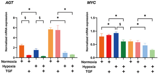 Effects of TGF-β2 on mRNA expression of the possible up-stream regulators of 3D spheroids; STAT3, IL6, FOS, TGFb1, AGT and MYC of 2D and 3D HRPE cells under normoxia or hypoxia conditions. Two-dimensional and three-dimensional cultured HRPE cells at Day 6 prepared under normoxia or hypoxia conditions were treated without (control) or with a 5 ng/mL solution of TGF-β2 (TGFβ), and each sample was subjected to qPCR analysis and the expression of mRNA in the possible up-stream regulators requiring for the generation of the 3D spheroids [36]; STAT3, IL6, FOS, TGFb1, AGT and MYC, were estimated. All experiments were performed in duplicate using fresh preparations (2D; n = 5, 3D; n = 10 spheroids each). “+” is reagents addition. Data are presented as the arithmetic mean ± the standard error of the mean (SEM). * p < 0.05 control vs. TGF, § p < 0.05 normoxia vs. hypoxia (ANOVA followed by a Tukey’s multiple comparison test).