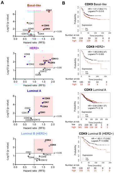 Correlation between CDKs expression level and clinical outcome in breast cancer. Graphs displaying HR values and p-value derived from the logrank test extracted from Kaplan–Meier survival plots of the association between CDKs individually expressed and patient prognosis, including relapse-free survival (RFS), for breast subtypes: basal-like (n = 417), Luminal A (n = 952), HER2+ (n = 198), and Luminal B with Status HER2+ (n = 263). CDKs with a significantly detrimental outcome association are included in highlighted square (A). Kaplan–Meier survival plots of the association between CDK9 mean expression levels and patient prognosis, including relapse-free survival (RFS) (n = 1764) for all breast subtypes: basal-like (n = 417), Luminal A (n = 952), HER2+ (n = 198), and Luminal B with Status HER2+ (n = 263) (B).