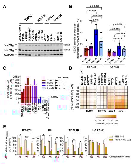 Evaluation of CDK9 protein expression and antiproliferative activity of SNS-032 and THAL-SNS-032 in breast cancer cell lines. Protein levels of CDK9 in all cell lines were analyzed by Western blot (A). Band quantification of CDK9 protein level referred to GAPDH as the loading control (B). THAL-SNS-032 EC50 obtained by MTT proliferation assays in breast cancer cell lines after 72 h of treatment (C). Heat map depicting the effect of different doses of THAL-SNS-032 in cell death in a breast cancer cell line panel (D). THAL-SNS-032 reduced cell viability more than SNS-032 in BT474, BT474-RH, BT474-TDM1R, and BT474-LAPA-R at the doses indicated (72 h). We used MTT assay (E). * p < 0.05; ** p < 0.01; *** p < 0.001.