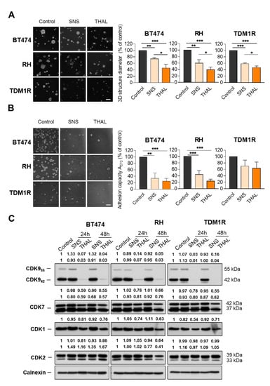Antitumoral effect of SNS-032 and THAL-SNS-032 in 3D-matrix and adhesion assays in breast cancer lines and CDKs protein level evaluation after treatments. SNS-032 or THAL-SNS-032 (100 nM) was applied for 72 h to BT474, RH, and TDM1R cells seeded in a Matrigel matrix. Results presented refer to control cells. Scale bar = 100 μm (A). Cell adhesion to fibronectin substrate after 24 h of exposure to SNS-032 or THAL-SNS-032 (100 nM) (B). Expression levels of CDK9, CDK7, CDK1, and CDK2 in BT474, RH, and TDM1R cells treated with SNS-032 and THAL-SNS-032 at the times indicated at 50 nM. Scale bar = 100 μm (C). * p < 0.05; ** p < 0.01; *** p < 0.001.