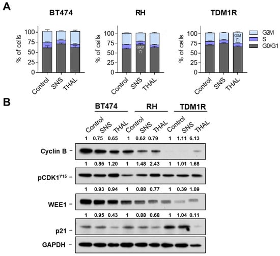 Cell cycle analyses of SNS-032 and THAL-SNS-032 in BT474 and BT474-derived cell lines representative of adaptive resistance. Bar graph showing populations generated by flow cytometry in each phase of cell cycle for BT474, RH, and TDM1R cells of SNS-032 (50 nM) and THAL-SNS-032 (50 nM) for 24 h (A). Expression of proteins involved in cell cycle in cell lines treated with SNS-032 (50 nM) and THAL-SNS-032 (50 nM) for 24 h. GAPDH was used as a loading control (B). * p < 0.05.