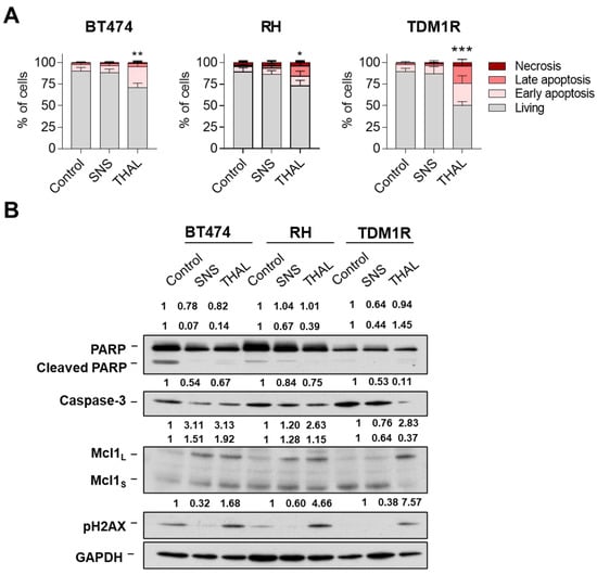 To explore the mechanism by which THAL-SNS-032 affects viability, we first performed cell cycle analyses of the more sensitive cell lines. BT474, BT474-RH, and TDM1R were treated with SNS-032 or THAL-SNS-032 and, after 24 h, stained with propidium iodide. When evaluating the cell cycle phases using that experimental setting, no major changes were observed with either compound, the kinase inhibitor, and the CDK9 PROTAC, except in the case of a slight increase in G2 with THAL-SNS-032 in TDM1R (Figure 4A and Supplementary Materials Figure S3A). THAL-SNS-032 was able to reduce the levels of p21 more clearly in the TDM1R cell line. No changes were detected with SNS-032. A reduction in WEE1 was observed for both compounds in TMD1R cells, slightly observed in RH. Finally, an interesting finding was the fact that cyclin B was not present of TDM1R in comparison with the trastuzumab resistant and parental BT474 cell lines (Figure 4B). As no clear modifications in any phase of the cell cycle were identified after the administration of SNS-032 or THAL-SNS-032, we therefore inferred that the mechanism of action did not involve cell cycle arrest. To further elaborate on this, we proceeded to evaluate cell death induction.