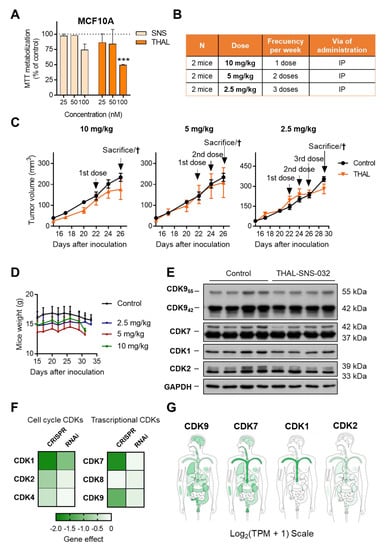 THAL-SNS-032 therapeutic index exploration. Normal breast cancer cell line MCF10A was treated with 25, 50, and 100 nM of SNS-032 and THAL-SNS-032. Proliferation was evaluated by MTT assay after 72 h of treatment (A). Table summary of THAL-SNS-032 doses, frequency, and route of administration in in vivo studies (B). Mice engrafted with BT474 cells were treated with THAL-SNS-032 (at indicated doses, I.P.) and controls with excipient. Mean of tumor volume ± SEM at each point was represented. Day of dose administration and sacrifice are indicated in each graph (C). Mice weight during the in vivo experiments. Treated mice (specially 10 mg/kg and 5 mg/kg) lost weight after THAL-SNS-032 administration (D). Western blot showing the expression levels of CDKs in tumors treated or untreated with THAL-SNS-032 (E). Heat map of the dependency score obtained by DepMap to evaluate CDKs dependency after CRISPR (DepMap 21Q3 Public + Score, CERES) or RNAi (Achilles + DRIVE + Marcotte, DEMETER2) inhibition (F). Body map showing expression of CDK9, CDK7, CDK1, and CDK2 in normal tissues in Log2(Transcript Per Million + 1) Scale. Adapted from: GEPIA2 web server (Gene Expression Profiling Interactive Analysis. http://gepia2.cancer-pku.cn/, accessed on 27 May 2021) (G). *** p < 0.001.