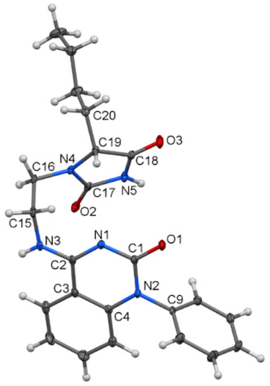 In 5d (Figure 1), the planes of the imidazolidine-2,4-dione and 1,2-dihydroquinazolin-2-one parts, which are separated by an iminoethane bridge, exhibit an interplanar angle of 26.16(9)°. The two molecules are interconnected by C=O···H–N bridges (see Supplementary Materials, Figure S29).