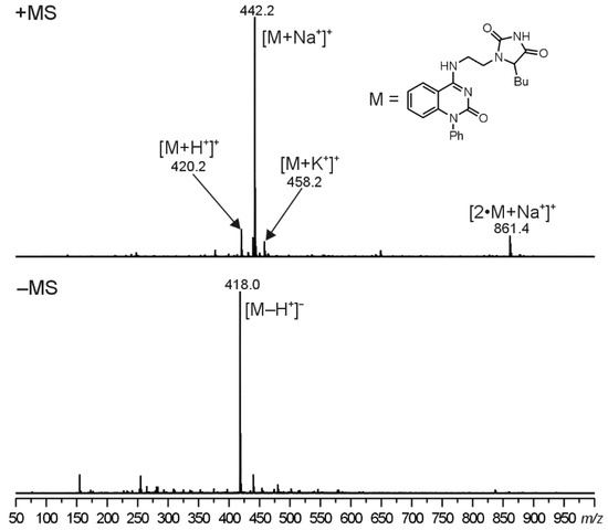 The molecular structure of compounds 5 were proved using ESI-MS/MS analyses. In the positive-ion first-order mass spectra, four singly charged ions were observed. The most abundant ion, assigned as a sodium adduct of the molecule ([M+Na+]+), was accompanied by two less intense signals at m/z corresponding to a protonated molecule ([M+H+]+) and a potassium adduct of the molecule ([M+K+]+). Moreover, a sodium adduct of the dimer ([2 M+Na+]+) was observed in the case of compounds 5. In the negative polarity mode, an ion assigned as a deprotonated molecule ([M+Na+]+) was formed. Illustrative ESI mass spectra for compound 5d can be seen in Figure 2 (ESI-MS spectra for compounds 5b and 5e are given in the Supplementary Materials, Figures S47 and S48, respectively).