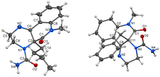 The molecular structure of compounds 7a (Figure 3, left) and 7b (Figure 3, right) were proven by X-ray analysis. The structures of 7a and 7b are characterized by the presence of substituted tricyclic systems where the π―electron conjugation is interrupted by the presence of a stereogenic center at C-2 (7a) and or C-11 (7b) as well as an ethylene bridge. The constitution of the tricyclic system in 7a is totally unknown. On the other hand, the characteristic interatomic distances and angles in both compounds that crystallize in achiral space groups P21/c and P-1, respectively, are essentially the same as previously known structures with the same type of functional groups and atom hybridization [37,38].