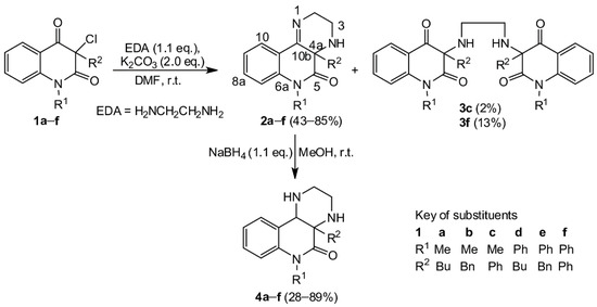 Considering these results, we decided to study the reactions of 3-chloroquinoline-2,4-diones 1 with 1,2-diamines. In the literature, most of the reactions reported are of α-haloketones with o-phenylenediamines. Surprisingly, reactions of tertiary α-bromoketones with aliphatic 1,2-diamines have only been described in one article [22].