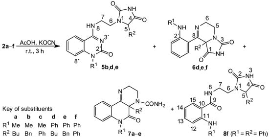 Compound 5d consists of two bioactive moieties: 4-iminoquinazolin-2-one and substituted hydantoin. Several methods for the preparation of closely related quinazolin-4-ones [33] and quinazoline-2,4-diones [34] were recently described; however, none of them are remotely similar to the presented transformation. It must be pointed out that the reaction of compounds 2 with HNCO was carried out with a molar ratio 1:1.6 because we did not anticipate initially the reaction of compound 2 with more than one mole of isocyanic acid. Therefore, complete conversion of compounds 2 to 5 cannot be expected, but rather, only the formation of a mixture of products can proceed (Table 1). Using an excess of KNCO, the composition of the reaction products changed (Table 1), but at no time was the full conversion of 2 to 5 achieved.