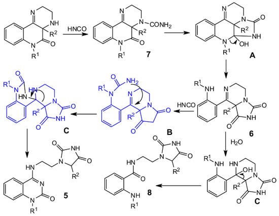 In conclusion, the tetrahydropyrazino[2,3-c]quinolin-5(6H)-ones 2 react with isocyanic acid to give (2-oxo-2,3-dihydroquinazolin-4(1H)-ylidene)-amino)ethyl) imidazolidine-2,4-diones 5, 2-(phenylamino)phenyl)-5,6-dihydroimidazo[1,5-a]pyrazine-diones 6, and 5-oxo-tetrahydropyrazinoquinoline-4-carboxamides 7. The molecular structures of the isolated compounds were suggested according to 1H, 13C and 15N NMR and electrospray-ionization mass spectrometry experiments. The structures of compounds 5d, 7a, and 7b were proved using X-ray analysis of crystalline material. Moreover, we proposed a mechanism for the molecular rearrangement of starting compounds 2 providing two hitherto unknown hydantoin-based derivatives 5 and 6. Retro-Claisen condensation seems to be a key step in the formation of the corresponding compounds. The presented work extends the set of compounds containing a hydantoin structural motif and offers a new approach for their synthesis. According to the previously described anticancer activity of several hydantoin-based derivatives [28], we decided to screen compounds 5, 6, and 7 for antiproliferative activity by using two cancer cell lines, K-562 and MV4;11. The inhibitory potency of these compounds for two types of protein kinases (CDK2/cyclin E and ABL1) was also assayed. However, no biological activity was observed for the tested molecules.