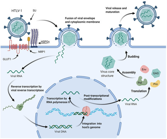 Furthermore, HTLV infects mainly T lymphocytes but is also capable of infecting monocytes and dendritic cells due to its direct interaction with glucose transporter 1 (GLUT 1), which is ubiquitously expressed on cell surfaces (Figure 1) [18,19,20,21].