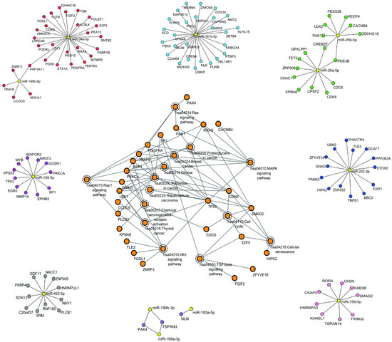 There was a significant enrichment of miRNA target genes in important KEGG pathways for cancer, such as hsa05200: Pathways in cancer; hsa04310: WNT signaling pathway; hsa04010: MAPK signaling pathway; hsa04350: TGF-β signaling pathway; hsa04014: Ras signaling pathway, all shown at central interaction network in Figure 2, which presented 39 nodes and 80 edges and a density equal to 0.054. A full scope of all identified pathways and targeted gene ontology can be found in Supplementary Table S1.