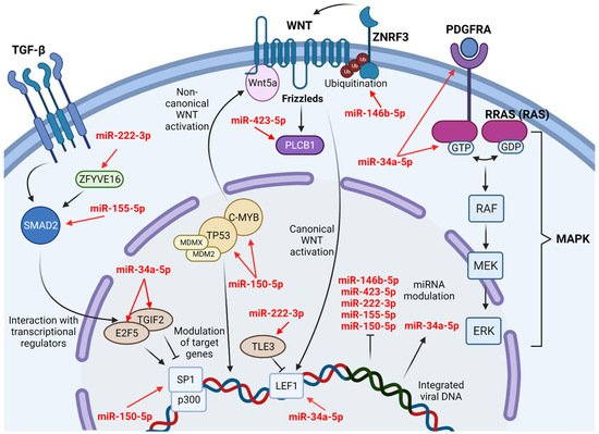 Another important interaction of miR-34a-5p was with RAS and MAPK pathways, through RAS-related (RRAS) gene and platelet-derived growth factor receptor (PDGFR), specifically PDGFRA, a classic proto-oncogene encoding receptor tyrosine kinases [114].