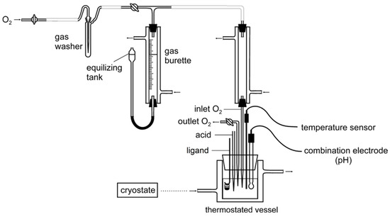 The isobaric laboratory set for volumetric and pH-metric measurements (Figure 2) comprised a double-walled thermostated glass vessel of volume ca 80 mL, tightly closed with a silicon stopper. This vessel was equipped with a burette nozzle supplying the 4 M HNO3, GK 241C combination electrode, Radiometer Analytical 101 temperature sensor, gas inlet tube (dioxygen) connected with the gas burette, outlet tube, glass rod for hanging the glass vessel containing the small ligand, PHM 85 Precision pH-meter Radiometer (Copenhagen), Fisherbrand FBC 620 cryostat, Fisher Scientific, Electromagnetic Stirrer ES 21H (Piastów, Poland) and oxygen tank with reducing valve.