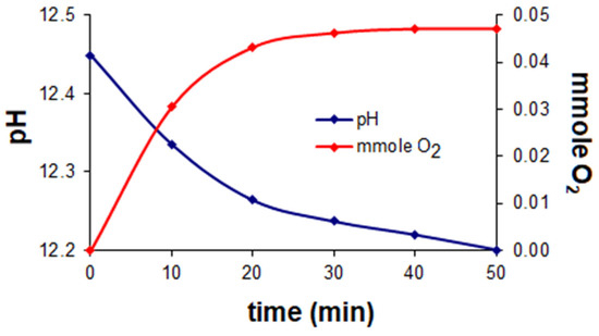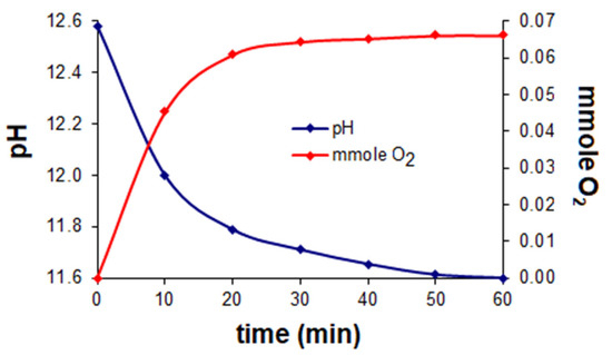 Simultaneous volumetric and pH-metric measurements in the presence of dioxygen were carried out by means of an isobaric laboratory set at ~0 °C (Figure 2). The pH was controlled by a precision PHM 85 pH-meter Radiometer (Copenhagen) with a GK 241C combination electrode. The sample volume was 30 cm3 in 3/27 (v/v) DMSO/water solution. The results indicated that the optimum ligand-to-metal concentration ratio was 2:1, cobalt concentration 3.3 × 10−3 M. Investigations of oxygenation of the Co(II)-Hpop and Co(II)-Hpoa systems indicated that dioxygen uptake is accompanied by a rise in pH to 11–12. The number of mmoles of bound dioxygen peaked at ~0.07 mmole per of 0.1 mmole cobalt (for Co(II)-Hpoa) (Figure 3) and ~0.05 mmole per of 0.1 mmole cobalt (for Co(II)-Hpop) (Figure 4).