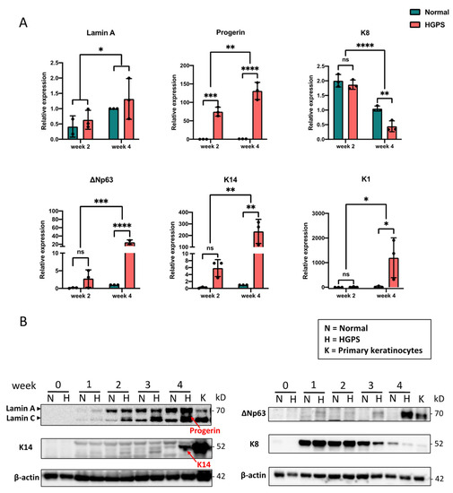 - Wang, Y.; Panteleyev, A.A.; Owens, D.M.; Djabali, K.; Stewart, C.L.; Worman, H.J. Epidermal Expression of the Truncated Prelamin A Causing Hutchinson-Gilford Progeria Syndrome: Effects on Keratinocytes, Hair and Skin. Hum. Mol. Genet. 2008, 17, 2357–2369. [Google Scholar] [CrossRef] [Green Version]