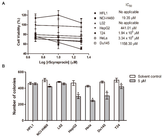 Anticancer activity of recombinant scyreprocin (rScyreprocin). (A) Effect of rScyreprocin on cell viability. Cells were incubated with various concentrations of rScyreprocin for 24 h; the cell viability was assessed by MTS method (n = 3). (B) Effect of rScyreprocin on colony formation ability. Cells were incubated with 5 μM rScyreprocin for 48 h and grown in rScyreprocin-free culture medium for another 12 days; colonies that contained > 50 cells were then counted and analyzed (n = 3). Data in (A,B) are presented as means ± standard deviations (SD). * p < 0.05 (two-way ANOVA, Bonferroni post-tests).