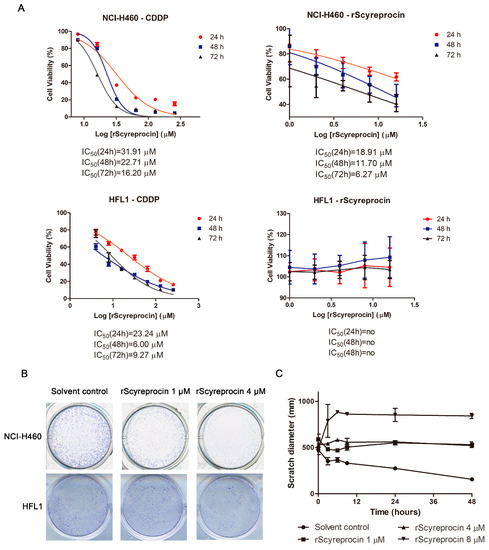 Recombinant scyreprocin (rScyreprocin) inhibited proliferation of H460 cells but not HFL1 cells. (A) Effects of rScyreprocin on H460 and HFL1 cell viability. Cells were incubated with various concentrations of rScyreprocin or CDDP; cell viability was determined by MTS method at different time points (n = 3). (B) Effect of rScyreprocin of H460 and HFL1 colony formation ability. Cells were treated with rScyreprocin for 48 h and cultured in rScyreprocin-free medium for another 12 days. Samples were fixed and stained with crystal violet before microscopic examination. (C) Inhibitory effect of rScyreprocin on H460 cell migration. Scratches of H460 were treated with various concentrations of rScyreprocin; the shortest distances between the edges were measured and analyzed at different time points (n = 3). Data in (A,C) are presented in means ± standard deviations (SD).