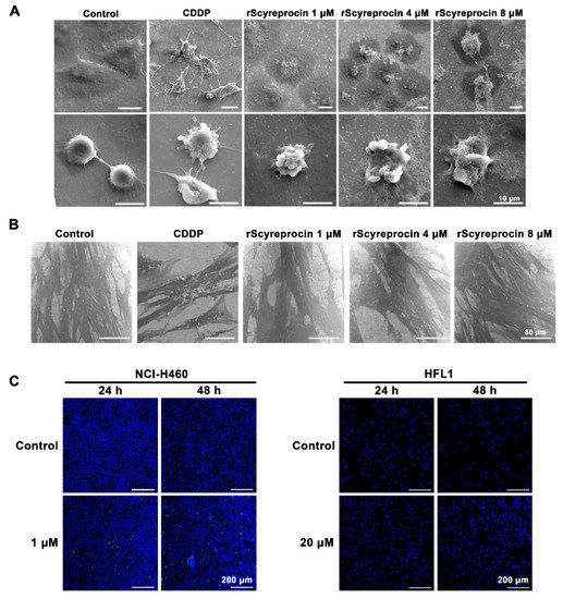 Recombinant scyreprocin (rScyreprocin) induced apoptosis and cell membrane destruction of H460 cells but not HFL1 cells. (A) Effect of rScyreprocin on H460 cell morphology. Cells were treated with rScyreprocin (0, 1, 4, and 8 μM) or cisplatin (CDDP) for 24 h and observed for morphological changes by a scanning electron microscope (SEM) (scale bar = 10 μm). (B) Effect of rScyreprocin on HFL1 cell morphology. HFL1 cells were incubated with rScyreprocin (0, 1, 4, and 8 μM) or CDDP (32 μM) for 24 h and observed by a scanning electron microscopy (scale bar = 80 μm). (C) Apoptotic effect of rScyreprocin on H460 and HFL1 cells. Cells were incubated with rScyreprocin and evaluated for apoptosis using TUNEL staining. Nuclei were visualized by DAPI staining (blue); a positive signal (green) indicating apoptosis was detected in rScyreprocin-treated H460 cells but not in HFL1 cells (scale bar = 200 μm).