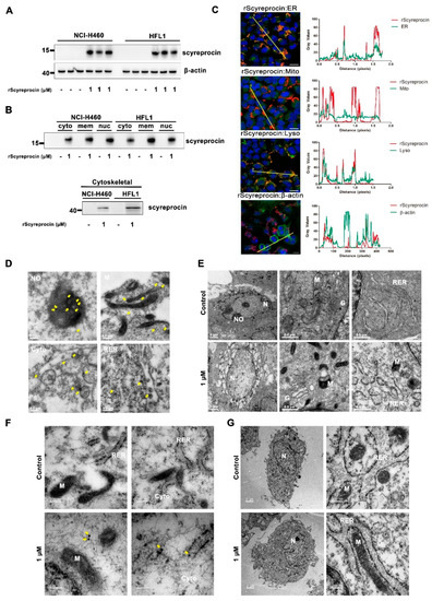 rScyreprocin could enter both H460 and HFL1 cells (Figure 4A), and was detected in all cell fractions (Figure 4B and Figure S3). rScyreprocin was co-located with ER and lysosomes of H460 cells (Figure 4C). TEM observation showed the location of rScyreprocin in rough endoplasmic reticulum (RER), mitochondria, cytoplasm, and nucleolus (Figure 4D). In rScyreprocin-treated HFL1 cells, rScyreprocin signals were only seen in the cytoplasm, and not localized to specific organelles (Figure 4F).
