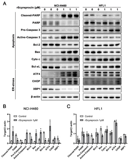 Recombinant scyreprocin (rScyreprocin) induced changes in expression levels of key proteins in pathways associated with apoptosis and ER stress. H460 and HFL1 cells were treated with rScyreprocin (0 and 1 μM) for 24 h. Levels of apoptosis-related and ER stress-related proteins in whole cell lysate (n = 3) were determined by Western blotting (A). Data were quantified using Image J Software and are presented in (B,C). Data are presented in means ± standard deviation (SD). In (B,C), data were normalized to the value of β-actin and analyzed by Student’s t-tests. (* p < 0.05).