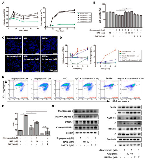 Recombinant scyreprocin (rScyreprocin) induced intracellular reactive oxygen species (ROSi) production, caused mitochondria dysfunction, and led to apoptosis of H460 cells. (A) Fold changes in intracellular Ca2+ and ROS levels of rScyreprocin-treated H460 cells (n = 3). Cells were treated with rScyreprocin. Data were collected at different time points, and normalized to the reads obtained at 3 h. (B) Inhibitory effect of rScyreprocin on NAC pretreated H460 cells. Cells were incubated with rScyreprocin for 24 h in the presence or absence of prior 1 h incubation with 10 mM NAC, and were evaluated for cell viability (n = 3). (C) Apoptotic effect of rScyreprocin on NAC and BAPTA pretreated H460 cells. Cells were treated with 1μM rScyreprocin for 24 h in the presence or absence of prior 1 h incubation with NAC or BAPTA, respectively. In situ cell death was determined by TUNEL assay. (D) Effect of rScyreprocin on intracellular Ca2+ and ROS levels. Samples were prepared as described in (C) and evaluated for fold changes in intracellular ROS and Ca2+ levels, respectively (n = 3). (E) Effect of rScyreprocin on mitochondrial membrane potential of H460 cells. Samples were prepared as described in (C), subjected to JC-1 staining, and analyzed with flow cytometry (n = 3). (F) Statistical analysis of the data presented in (E). (G) Expressions of apoptosis-related proteins in rScyreprocin-treated H460 cells. Samples were prepared as described in (C). Expressions of apoptosis-related proteins in whole cell lysate (left panel) and expressions of Bax, cytochrome c, and Bcl-2 in mitochondrial (M) and cytosolic (C) fractions (right panel) were determined. The experiments were carried out in three different occasions (n = 3) and quantified using Image J Software. Blots and quantification data of the replicates are presented in Figures S4–S6. Data are presented as means ± standard deviation (SD). In (A), data were normalized to the value of solvent control at 3 h. In (B), data were normalized to the control group and analyzed by one-way ANOVA with Tukey post-tests. In (D), data are presented as means ± SD, and data were normalized to values of control groups at each time point. In (F), data were analyzed by one-way ANOVA with Tukey post-tests (* p < 0.05; n.s.—non-significant).