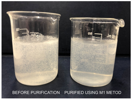 In the M1 purification method, 100 mL of CS dissolved in hydroxyacetic acid was transferred to a 250 mL separating funnel and washed 3 times with 50 mL of chloroform. After separation of chloroform, the CS hydrogel was transferred to a beaker, a 0.5 M sodium hydroxide solution was added during mixing until a pH value in the range of 9–10 was reached. This was equivalent to the complete precipitation of CS in the microcrystalline form. The precipitated CS was filtered using a seepage kit under reduced pressure and washed several times with distilled water until the pH of the rinsing water reached a value equal to 7.0. Finally, the precipitated CS was weighed, sterilised at 121 °C for 15 min (Systec VB-50, De Ville, Raszyn, Poland), and suspended in an amount of free endotoxin distilled water to obtain a 1% (m/v) CS solution. The CS suspension was homogenized at 10,000 rpm for 3 min (Silent Crusher M, Heidolph Instruments GmbH & Co. KG, Kelheim, Germany) and then saturated with CO2 by simultaneous mechanical mixing using a hollow shaft stirrer for gas saturation (BIO-MIXBMX-10, Gdańsk, Poland) until completely dissolved.
