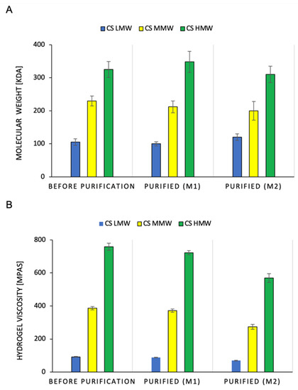 Figure 3 shows the effect of the purification methods on the change in the molecular weight of CS and the viscosity of the hydrogels. Regardless of the purification method used, the molecular mass of the CS did not significantly change. This applies to the low, medium, and high molecular weights of the polymers (Figure 3A). It was observed that the M1 purification method reduced the viscosity of the CS hydrogel by 3.6–4.7%. In contrast, for the M2 method, the losses were much greater, ranging from 24.8% to 29% (Figure 3B). The obtained results indicate that the CS chain did not degrade during purification, which could be initiated by the action of high temperature (Figure 6). A significant reduction in the viscosity of the hydrogels after M2 purification was due to the loss of CS during the washing of the sediment with chloroform. Chloroform physically delaminated the CS precipitate obtained by precipitation with NaOH. In the M1 method, this was not the case because the extraction of the toxins with chloroform occurred immediately after the dissolution of CS in the hydroxyacetic acid solution. Under these conditions, chloroform spontaneously separates from the aqueous layer containing the polymer.
