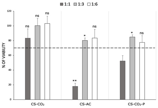 The cytotoxicity of chitosan hydrogels: chitosan dissolved by CO2 saturation method (CS-CO2), chitosan dissolved in hydroxyacetic acid (CS-AC), and chitosan hydrogel purified by M1 method (CS-CO2-P) following 24 h of incubation at different dilution factors (1:1, 1:3, and 1:6) against L929 cells. Data are expressed as the mean ± standard deviation of three independent experiments. The results were analyzed by two-way ANOVA with Dunnett’s multiple comparisons vs. Control: ns (not statistically significant, p > 0.05), * p < 0.01, ** p < 0.001.