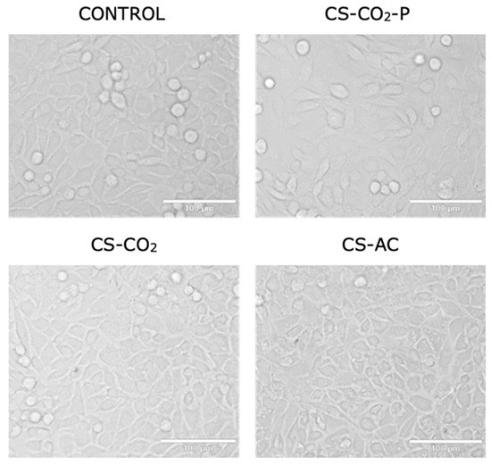 Representative image at 200× magnification of L929 cells following 24 h of treatment with chitosan hydrogels: CS-CO2, CS-AC, and CS-CO2-p at 1:3 diluent factor. The scale bar is 100 µm.