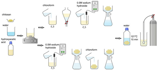 In the M2 purification method, 100 mL of CS dissolved in hydroxyacetic acid was first treated with 0.5 M sodium hydroxide solution during mixing until a pH value in the range of 9–10 was reached. The precipitated CS was then filtered using a seepage kit under reduced pressure, washed 3 times with 50 mL of chloroform, and several times with distilled water until the pH of the rinsing water reached a value equal to 7.0. Finally, the precipitated CS was weighed, sterilised at 121 °C for 15 min (Systec VB-50, De Ville, Raszyn, Poland), and suspended in an amount of free endotoxin distilled water to obtain a 1% (m/v) CS solution. The CS suspension was homogenized at 10,000 rpm for 3 min (Silent Crusher M, Heidolph Instruments GmbH & Co. KG, Kelheim, Germany) and then saturated with CO2 by simultaneous mechanical mixing using a hollow shaft stirrer for gas saturation (BIOMIXBMX-10, Gdańsk, Poland) until completely dissolved.