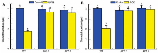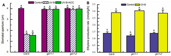 2.1. GCR1 Positively Regulates UV-B- and Ethylene-Induced Stomatal Closure