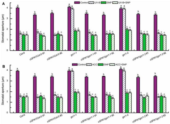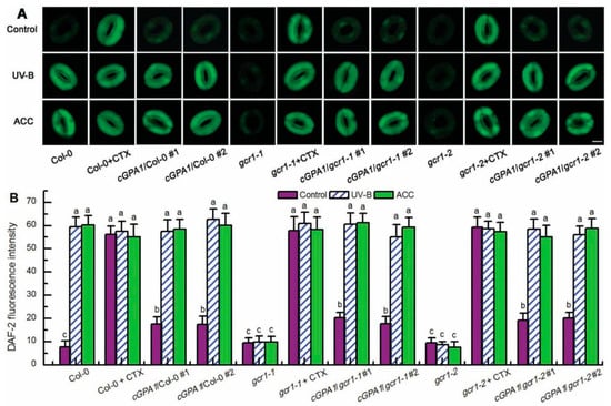 2.4. GCR1 Mediates UV-B- and Ethylene-Induced Stomatal Closure by Activating GPA1-Dependent NO Production in Guard Cells