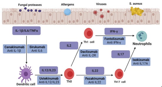Figure 2 shows various biological therapies for non-type 2 inflammatory diseases, which may be applied to CRSsNP in the future. The biological agent ustekinumab, anti-IL-12/23, has shown good efficacy in joint pain and psoriatic arthritis in clinical studies involving more than 150 patients. It showed high sensitivity to pyoderma gangrenosum and erythema nodosum in seven studies, including 65 patients [60]. In a controlled study involving 230 patients with multiple sclerosis, the lesion site in the daclizumab group targeting IL-2R was more than 70% less than that in the placebo group. The incidence of side effects in the two groups was the same, such as skin rash and infection [61]. A randomized study evaluated the safety and efficacy of fontolizumab, an antibody targeting IFN-γ, in 135 patients with Crohn’s disease. The results showed that the C-reactive protein level in the treatment group decreased significantly and was well tolerated without severe side effects [62]. Canakinumab is a biological agent targeting IL-1 β. In a clinical study evaluating whether canakinumab can be used to treat autoimmune recurrent fever syndrome, the results showed that canakinumab could effectively control and prevent attacks in patients with various autoimmune diseases, with an effective rate of more than 70% [63]. A phase III clinical study reported the efficacy of sirukumab targeting IL-6 in treating rheumatoid arthritis. This 2-year study involving more than 1000 patients showed that sirukumab treatment reduced the clinical signs and symptoms of patients with rheumatoid arthritis and minimized the progress of radiographic damage [64]. Ixekizumab, an antagonist of IL-17A, can disrupt the inflammatory cascade in psoriasis [65]. The phase III clinical trial results showed that nearly 90% of patients treated with ixekizumab for 12 weeks showed efficacy, and the area severity index of psoriasis decreased by 75% [66]. The efficacy and safety of fezakinumab (an IL-22 monoclonal antibody) in patients with moderate-to-severe AD were evaluated in a phase 2 clinical trial [67]. After 10 weeks of treatment, the AD score of patients treated with fezakinumab was lower than that of patients treated with the placebo. None of the above drugs have been clinically evaluated in patients with CRS, but these studies may lead to studies related to non-type 2 CRS.