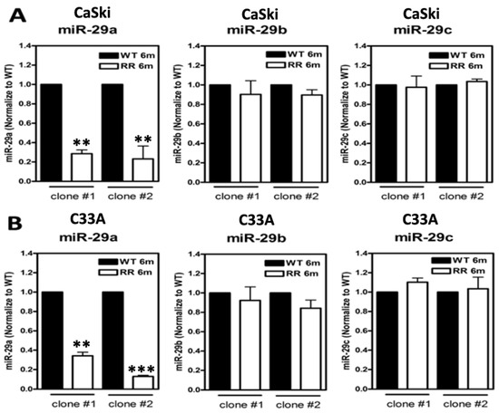 Suppressed miR-29a but not miR-29b/c in radioresistant (RR: 6 months) clones and their parental wild-type (WT) clones generated from CaSki and C33A cervical cancer cells. (A) Expression levels of miR-29a/b/c in WT and RR cervical cancer cells (CaSki) and (B) C33A cells. Cells were cultivated, collected, and the total microRNA was extracted, and expression levels of miR-29a, miR-29b, or miR-29c were estimated by quantitative RT-PCR analysis. The results were from two independent clones of CaSki and C33A cells, and each clone was repeated at least three times, and the results were similar. Data were shown as mean ± SD. ** p < 0.01, *** p < 0.001 for RR group vs. WT group.