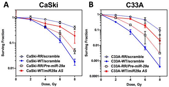 Radiation survival curve of CaSki and C33A cells performed on cells in log phase growth to evaluate the radiosensitivity. Wild-type (WT) cells were transfected with Scrambled NC (100 nM) or miR-29a antisense (also termed miR-29a AS; 100 nM), whereas the radioresistant (RR) cells were transfected with Scrambled NC (100 nM) or Pre miR-29a precursor (also termed Pre miR-29a; 100 nM), respectively. Cells were plated, irradiated, and assayed for clonogenic survival at the designated dosages. All of the clonogenic assays were repeated at least three times, as described in Section 4.5. The survival curve showed the reduced radiosensitivity of the stable radioresistant clones of (A) CaSki and (B) C33A cells to irradiation compared to their parental wild-type cells. RR-cells transfected with Pre miR-29a reduced the surviving fraction (elevated radiosensitivity), while WT-cells transfected with miR-29a AS enhanced the surviving fraction (decreased radiosensitivity). Shown are mean values, and error bars show the standard deviation (SD). Solid and dotted curves represent WT and RR cells, respectively. Filled circles, WT-Scrambled NC; open circles, RR-Scrambled NC. Filled squares, WT-miR-29a AS; open squares, RR- Pre miR-29a. Each experiment was performed in triplicate and the results were similar.