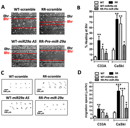 Radioresistant (RR) CaSki and C33A cells exhibited augmented migration in vitro, and overexpression of miR-29a effectively abrogated RR-augmented cell migration. (A) Representative phase-contrast micrographs depicting scratched monolayers of serum-starved WT and RR CaSki and C33A cells at 0 and 8 h. Scale bar = 100 μm. The results of each cell were repeated at least three times, and the results were similar. (B) Summary of wound healing 8 h after scratching. Data are shown as mean ± SD. (C) Representative cell migration trace from a time-lapse recording of cell migration over 8 h. The results are representative of C33A and CaSki cell clones, and each clone was repeated at least three times. Scale bar = 100 μm. (D) Summary of migration speed from a time-lapse recording of cell migration over 8 h. Data are the mean ± SD of three independent experiments. All radioresistant C33A and CaSki cell clones underwent stable selection for 6 months after irradiation, and >20 cells per individual sample were counted. * p < 0.05, ** p < 0.01, *** p < 0.001.