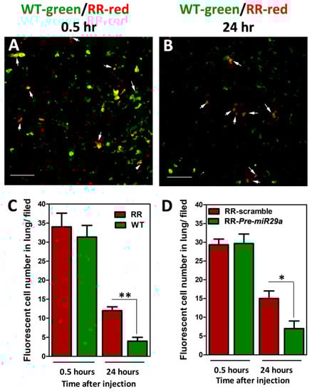 To elucidate whether the radioresistance-enhanced cervical cancer cell migrative property may lead to potent metastasis to the lung in vivo, we established the in vivo short-term lung locomotion metastasis model, as in our previous report [22]. Briefly, we injected wild-type (WT) and radioresistant (RR) CaSki cells, which had increased cell mobility, into BALB/c nude mice through the tail vein. For tracking the injected cells, CaSki cells were pre-labeled with fluorescent dyes before injection (herein, WT-CaSki cells were labeled in green fluorescence and RR-CaSki cells were labeled in red fluorescence), as described in Section 4.9. Then, the labeled cells were mixed in a 1:1 ratio and were injected into the nude mice. Mice were sacrificed at 0.5 or 24 h post-injection, and the lungs were collected and then utilized for producing frozen sections, as described in Section 4.10. As shown in Figure 5A, after 0.5 h of injection, the ratio of RR-CaSki cells (red) to WT-cells (green) retained in the lung was nearly 1:1 (after normalizing for the composition of the suspension before injection), representing that the injected cells metastasized equivalently to the lung at the early initiation time. After 24 h of injection, a notably increased number of RR-CaSki cells were retained in the lung compared to those of the WT-cell group. In a parallel experiment, RR-CaSki cells were transiently transfected with Scramble NC or Pre-miR-29a, respectively. Later, RR-scramble cells were labeled in red fluorescence and RR-Pre-miR-29a cells were labeled in green fluorescence before injection into BALB/c nude mice. Similarly, the ratio of RR-scramble (red) to RR-Pre-miR-29a (green) retained in the lung was nearly 1:1 after 0.5 h of injection (Figure 5D). Notably, after 24 h, the number of RR-Pre-miR-29a cells retained in the lung was dramatically diminished compared to the RR-scramble control group (Figure 5D). These results suggested that the radioresistance-enhanced cervical cancer cell mobility may promote the in vivo metastasis to the lung, and the forced introduced miR-29a effectively reduced the radioresistance-endorsed lung metastasis.