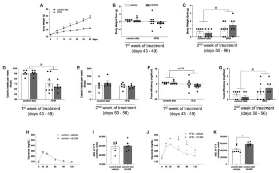 Effect of prolonged icv infusion of vehicle or HU308 for 2 weeks on the body weight, caloric intake, food efficiency ratio and GTT in animals fed a control diet or high-fat diet (HFD). Body weight curve in control diet-fed or HFD-fed animals before surgical procedure (A). The body weight gain (g) (B,C), caloric intake (Kcal) (D,E) and food efficiency (mg/Kcal) (F,G) after 1 or 2 weeks of icv vehicle or HU308 infusion in control diet-fed or HFD-fed animals. Plasma glucose levels (mg/dL) after glucose overload in control diet-fed (H) or HFD-fed (J) animals during prolonged infusion of vehicle or AM630. AUG of GTT in control diet-fed (I) or HFD-fed (K) animals treated with vehicle or AM630. One sample from HFD + vehicle group in the GTT study were not used because of problems with glucose overload injection. The data are expressed as the mean ± SEM; n = 5–8 per group. Data were analyzed by unpaired t test (I,K) or two-way ANOVA followed by Tukey’s (B–G) or Šídák’s (H,J) post-hoc test. @ p < 0.02 (effect of diet), * p = 0.05 (effect of HU308).