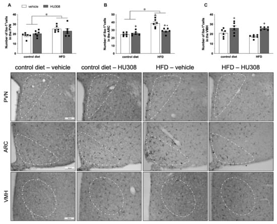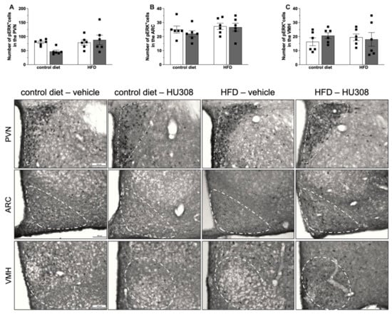 The two-way ANOVA revealed a significant effect of the diet on pSTAT3 expression in the PVN (p = 0.02), ARC (p = 0.001) and, VMH (p < 0.001) (Figure 4A–C, respectively), with increased pSTAT3 in HFD-fed animals compared to control diet group. The continuous infusion of HU308 induced no change in STAT3 phosphorylation in the PVN, ARC or VMH.