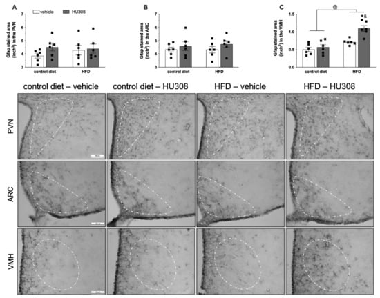 We observed no difference in GFAP expression in the PVN (Figure 3A) and ARC (Figure 3B) between the groups. In addition, we observed an effect of diet (p < 0.001), treatment (p = 0.002) and, an interaction (p = 0.02) between the groups on GFAP expression in the VMH. The post-test revealed increased GFAP staining in the VMH of HFD-fed animals treated with HU308 when compared to control diet-fed animals treated with HU308 (p < 0.001) and HFD-fed animals treated with the vehicle (p = 0.002) (Figure 3C).