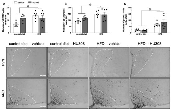 Effect of prolonged icv infusion of vehicle or HU308 for 2 weeks on the number of pSTAT3+ cells in the paraventricular (PVN), arcuate (ARC) and ventromedial (VMH) nuclei in animals fed a control diet or high-fat diet (HFD). Number of pSTAT3+ cells in the PVN (A), ARC (B) and VMH (C) nuclei in animals fed a control diet or HFD that received icv injection of vehicle (white bars) or HU308 (dark grey bars). The data are expressed as the mean ± SEM, n = 5–6 per group. One sample from control diet + HU308 group were missed during the pSTAT3 immunostaining protocol. Data were analyzed by two-way ANOVA followed by Tukey’s post-hoc test. @ p < 0.05 (effect of diet) Bottom panel: Representative photomicrographs of pSTAT3 immunostaining in the PVN (superior panel), ARC (central panel) and VMH (inferior panel) of control diet-fed or HFD-fed animals treated with vehicle or HU308.